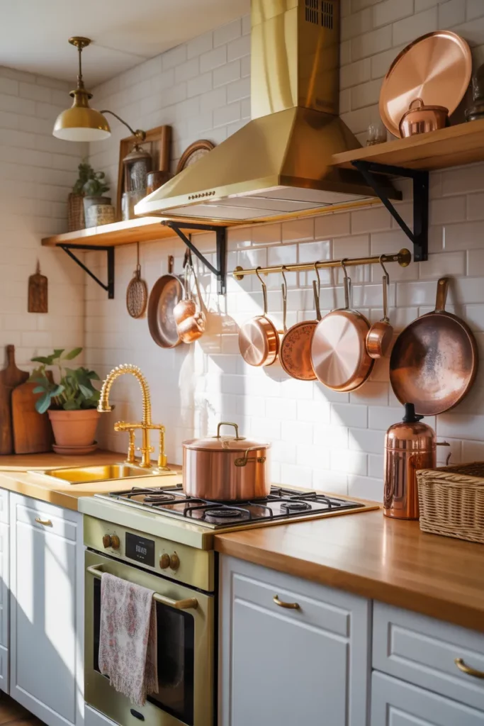 Warm metals such as copper and brass are perfect complements to boho kitchen ideas. They infuse rustic spaces with elegance and lend a handcrafted, old-world feel. Over time, their patina tells a story of use and age—something boho design embraces wholeheartedly.